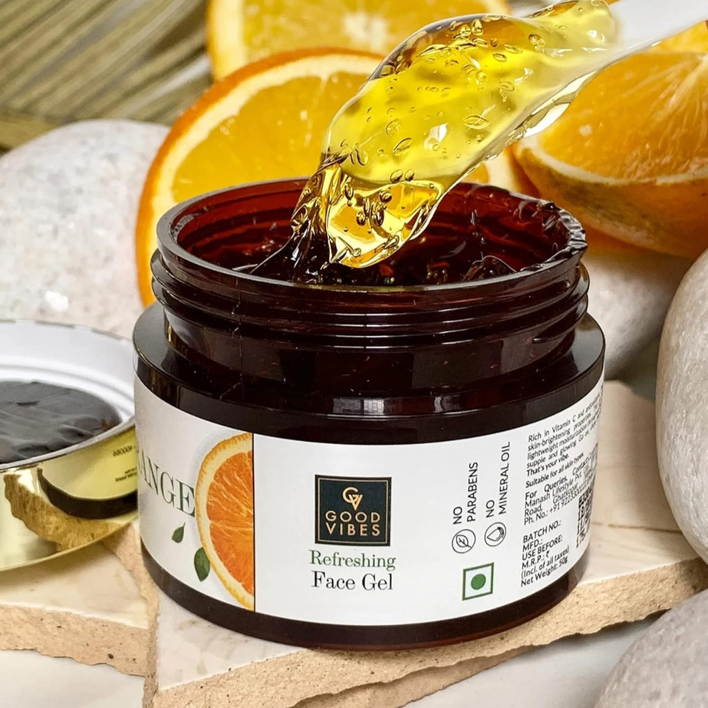 Revive your skin with the energizing power of oranges! Experience Good Vibes Orange Refreshing Face Gel and unlock a radiant, youthful glow. 🍊✨