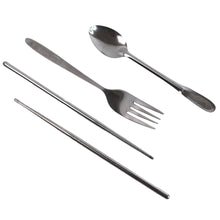 The 4-piece portable silverware set includes: dinner fork, dinner spoon, chopsticks, carrying case. Suitable for travel, camp, school or workplace. Easy to clean