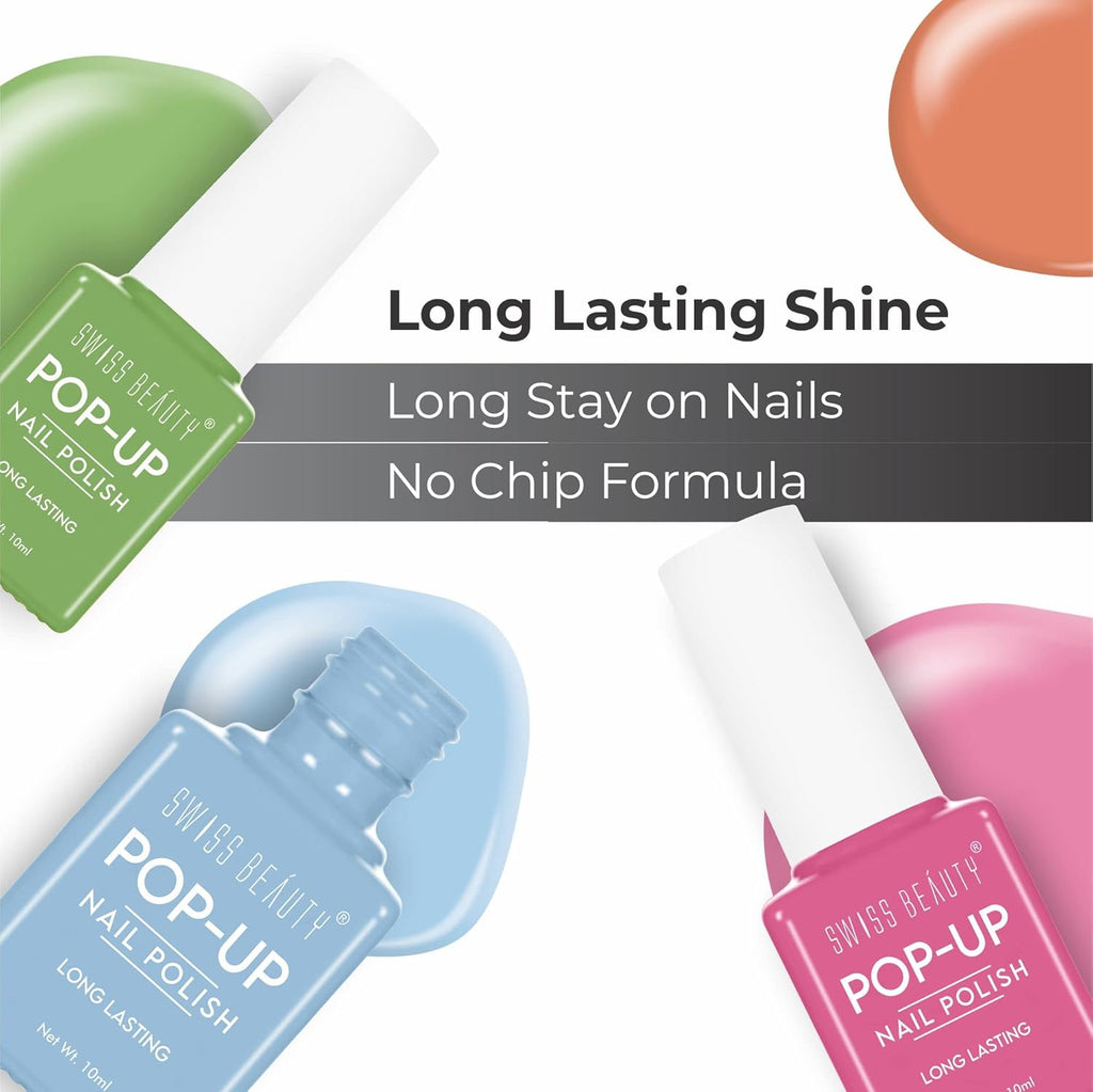 Add a pop of color to your nails with Swiss Beauty Pop-Up Nail Polish. Its quick-drying, chip-resistant formula offers vibrant, long-lasting shine. The smooth texture glides on effortlessly, giving you a salon-like finish in minutes. Available in a variety of trendy and classic shades to match every mood!