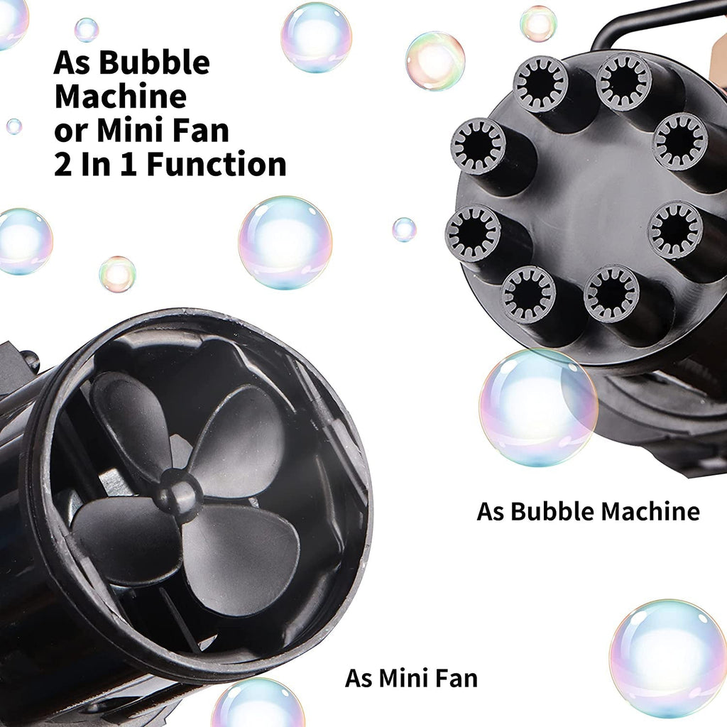 Mini Gatling Model 8 Holes Bubble Design 3 AA Batteries Required (not included). Looks cooler and more interesting. Cool Fan Mode The bubble machine can be used as a small fan, it will bring cool and comfortable wind. Take down the bubble machine gun head and turn it into a small fan. Easy To Use The bubble gun is made of quality ABS material, and has a handle design that fits the child's palm. Children can carry a bubble gun with them and enjoy the fun of bubbles.